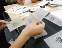 右:商品化するにあたり数多くのサンプルを作成し、名刺に合う線の太さや大きさ、描く素材など検討しました。